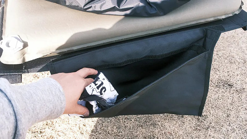 基本的にレッグポールを取り付けた「高さのある状態」で使用するのが望ましいですが、収納袋をサイドに取り付けることができます!ロースタイルでは地面についてしまうので、要注意。