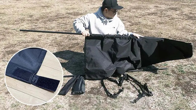 2本伸ばしたらシートの両脇にあるスリーブに通していきます。マジックテープの場所から挿していき、通したら止めましょう。