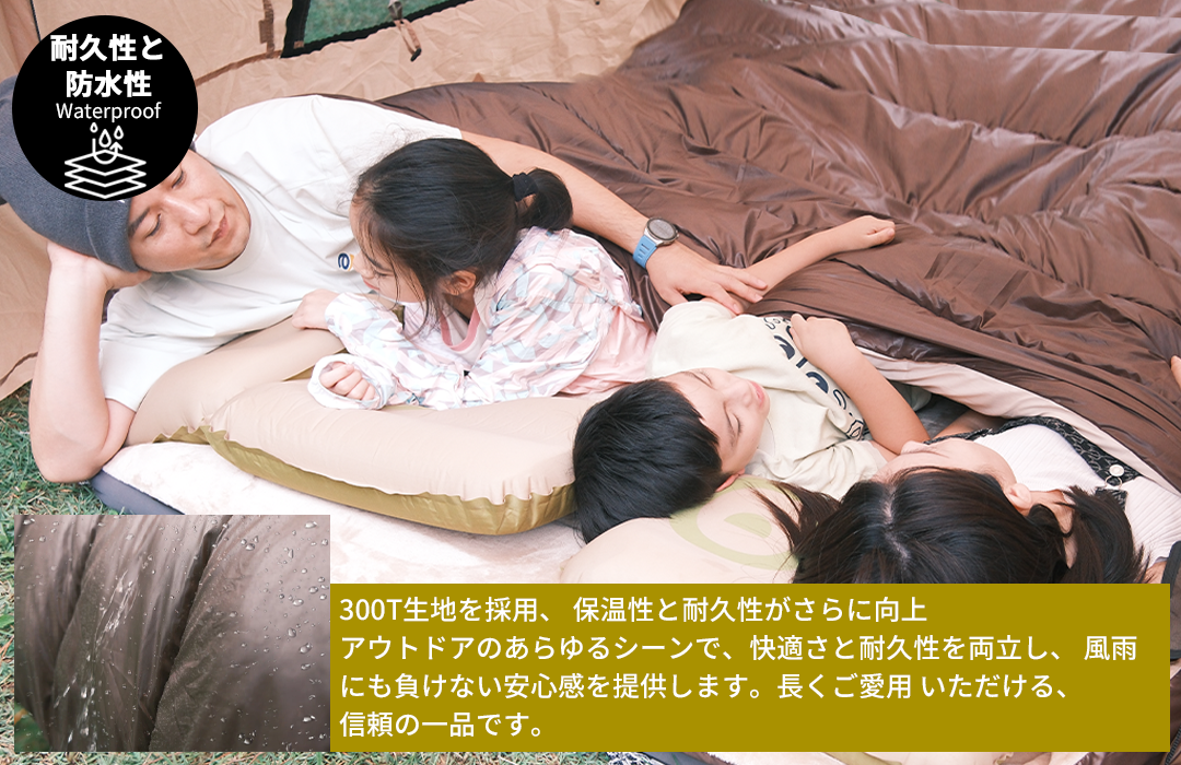 表面には防水性と耐摩耗性に優れた300T素材を使用しており、キャンプや車中泊でも湿気や凹凸な環境にしっかり対応できます。