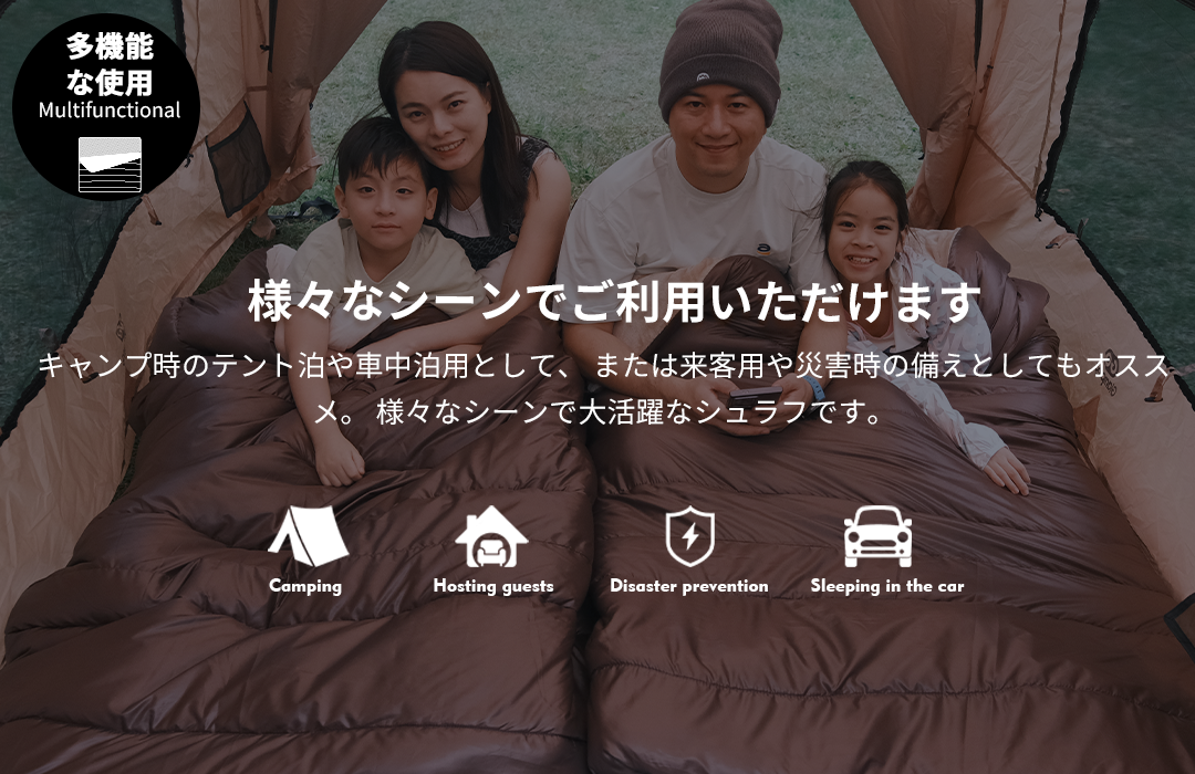 キャンプやアウトドアアクティビティにも対応できる多機能設計。寝袋として使用するだけでなく、アウトドアシ一ンでの多用途性を求めるユ一ザ一にとって、非常に実用的なアイテムです。