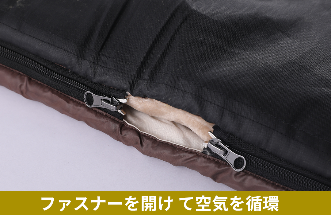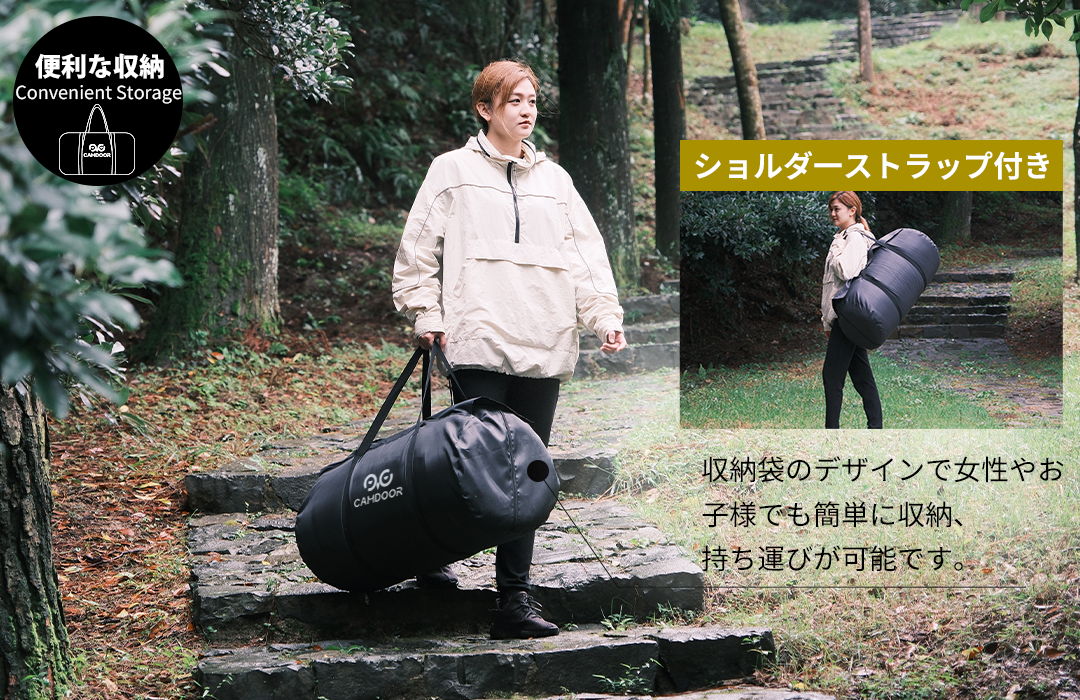 寝袋と収納袋が一体化されたデザインなので、丸めて収納袋をかぶせるだけで片付け完了。女性やお子様でも簡単に収納できます。忙しいアウトドアでもラクラク収納が可能です。