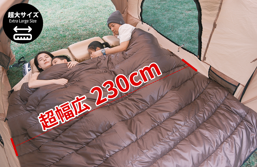 230×200cm の広々スペースが4人での同時使用に対応。ファミリーアウトドアには欠かせないアイテムで、どんな場面でも快適な睡眠空間を提供します。