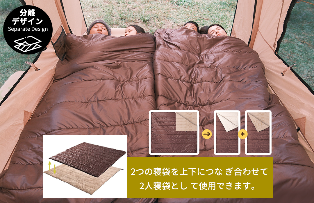 CAMDOOR Family Schlaf DXは、ジッパーで簡単に上下に分離でき、2枚の独立した寝袋として使用可能。季節や気温に応じて自由に調整し、最適な快適さを提供します。