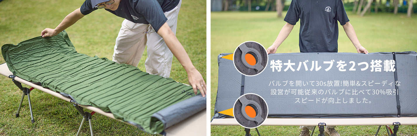 バルブを開くと自動で空気が入ります!さらに特大バルブを2個搭載した事で膨張スピードを上げました!約30秒ほどで使用できるまで膨らみます