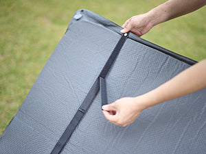 スリーピングマットのデザインは長方形で、両端にボタンが付いているので、複数のスリーピングマットをシームレスに連結することが可能です。