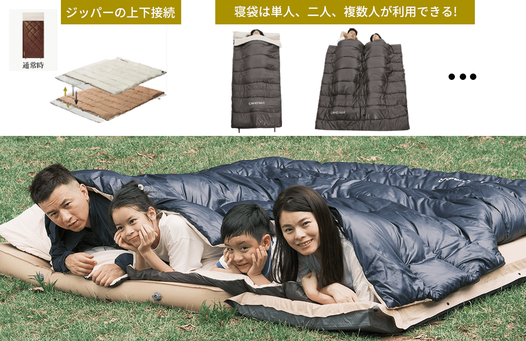 封筒型ならではのファスナーで自由に開閉でき、完全に開けば掛け布団のように使えます。同じモデルの寝袋を上下2つ繋げれば、最大4人(大人2人と子供2人)での使用が可能です。
