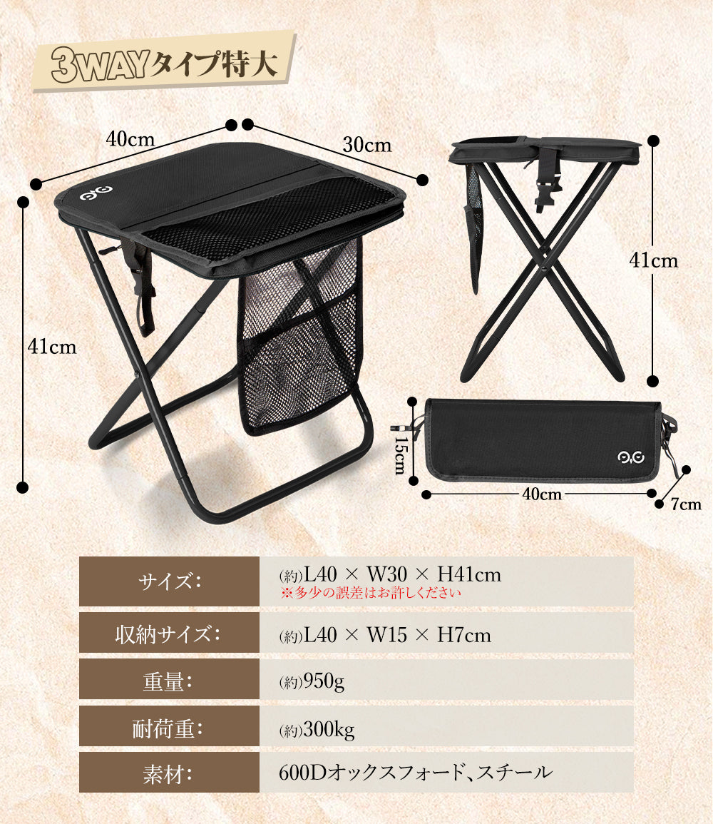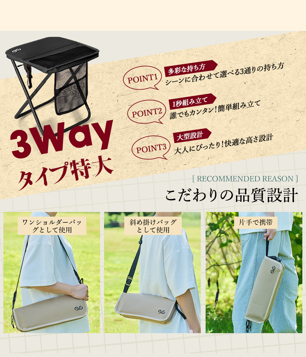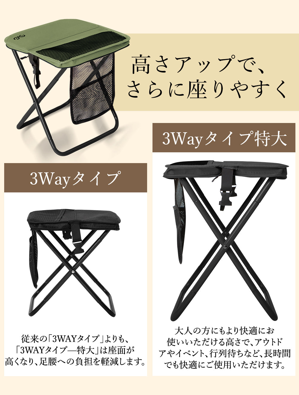 スツールには3つの収納スペースを搭載。展開時に使える大きなメッシュポケット、折りたたみ時でも使える内側のメッシュポケット、そして外側に便利なマジックテープ付きサイドポケット。スマホ、鍵、ティッシュ、小銭など、用途別にスッキリ収納できてアウトドアをもっと快適に。