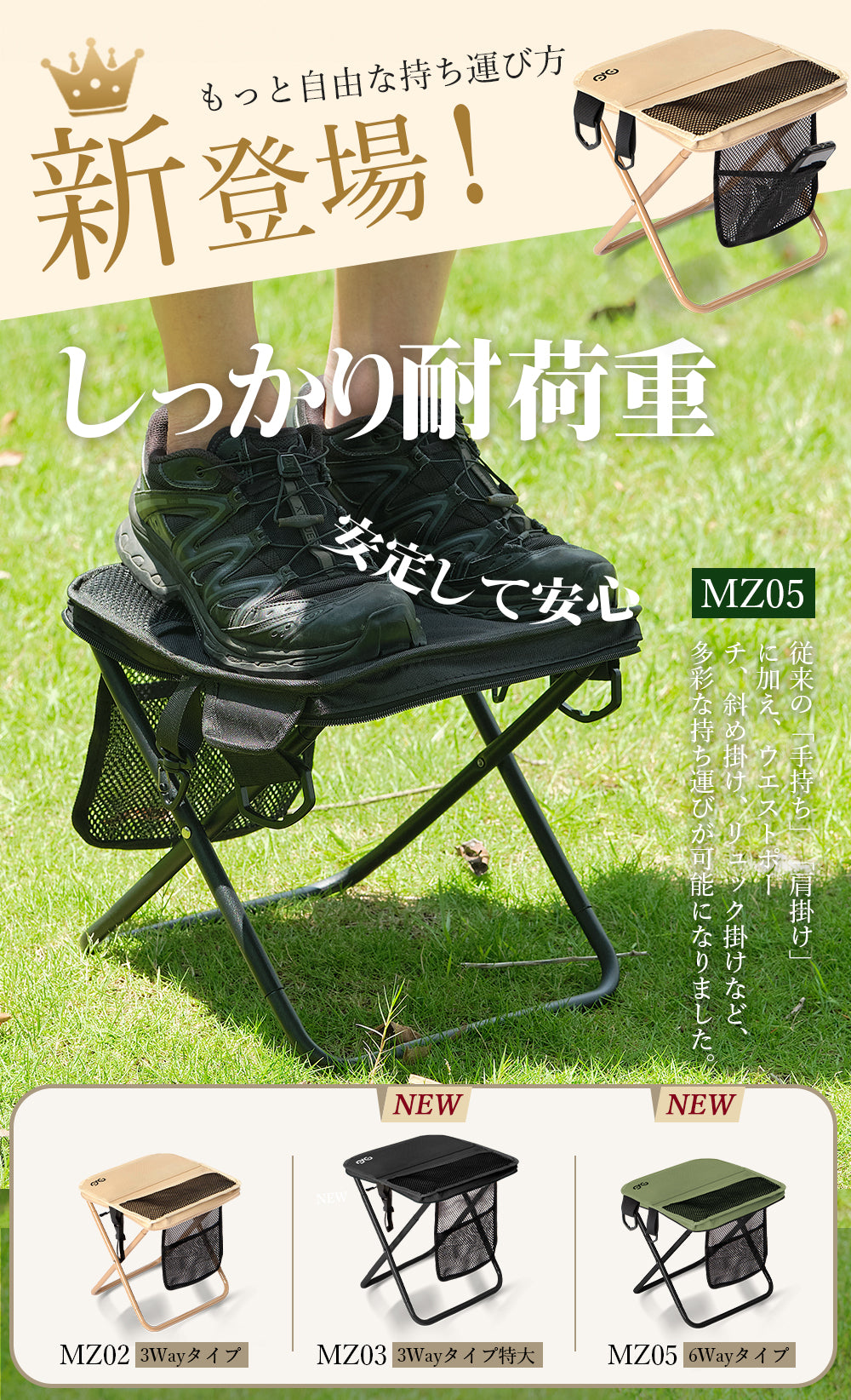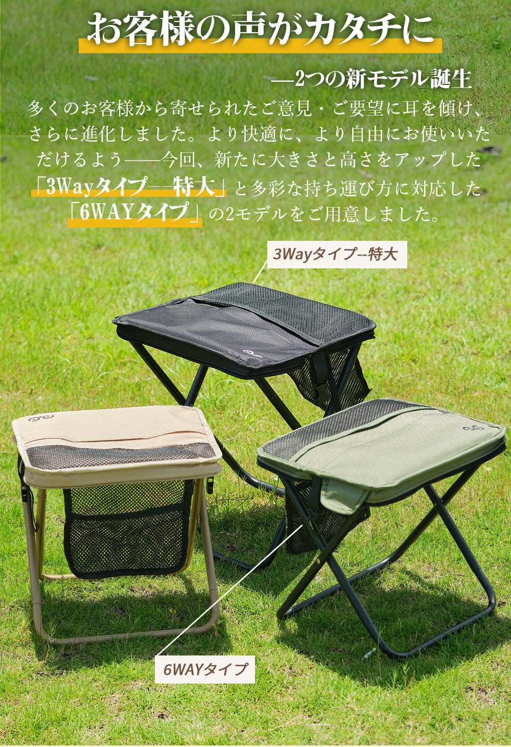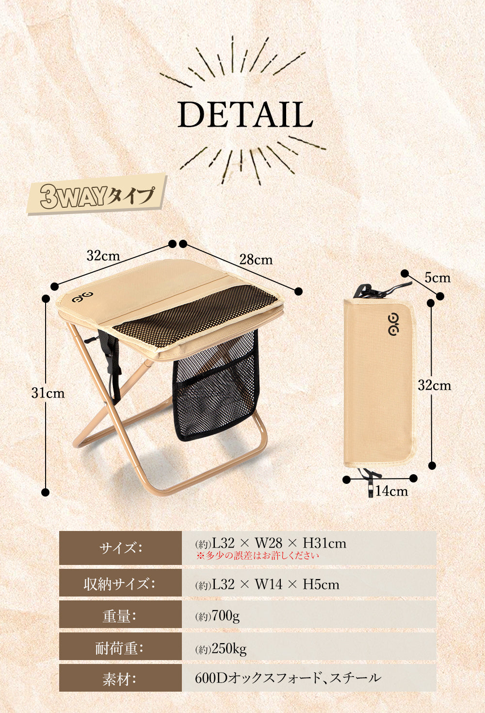 スツールには3つの収納スペースを搭載。展開時に使える大きなメッシュポケット、折りたたみ時でも使える内側のメッシュポケット、そして外側に便利なマジックテープ付きサイドポケット。スマホ、鍵、ティッシュ、小銭など、用途別にスッキリ収納できてアウトドアをもっと快適に。
