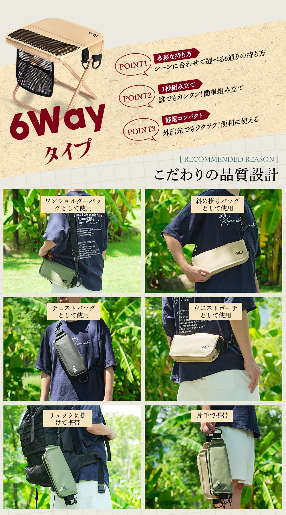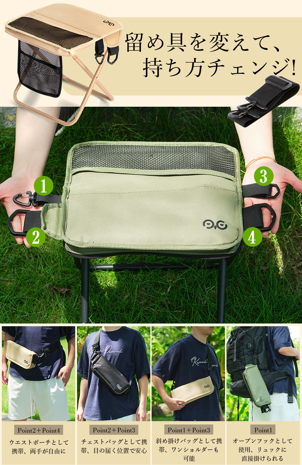 調整可能なバックル付きショルダーストラップが付属し、肩掛け・斜め掛け・手持ち・リュック収納・リュック外掛けなど自由に使い分け可能。両手が空くので、子連れやハイキングにも最適。どんなシーンにも柔軟に対応できます。