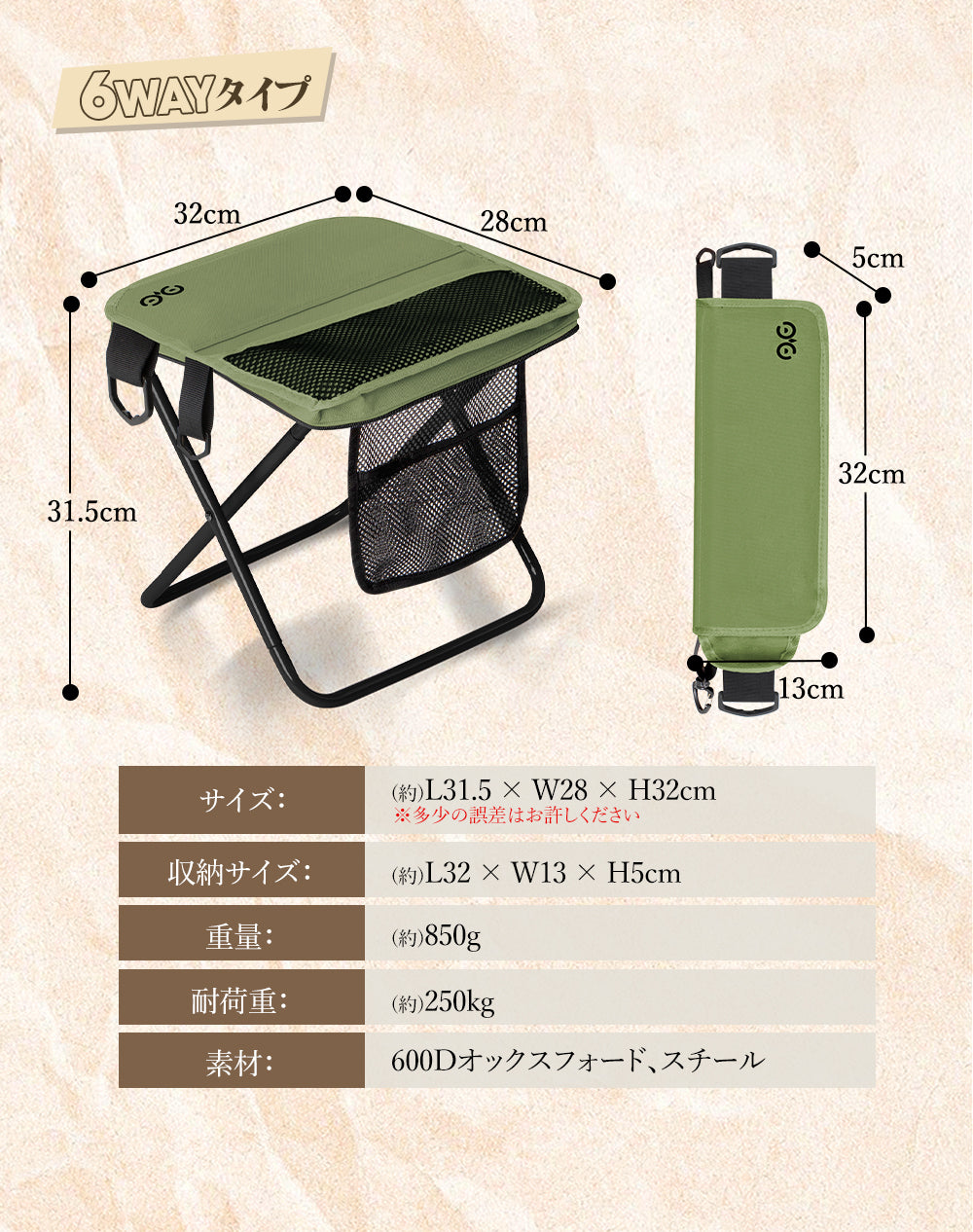 強化スチール製のX型3層構造により、最大250kgまでしっかり支えます。さらに600Dオックスフォード生地が耐久性と座り心地を両立。地面が少々不安定な場所でも安心して座れる安定性が魅力。壊れにくく、長く使える設計です。