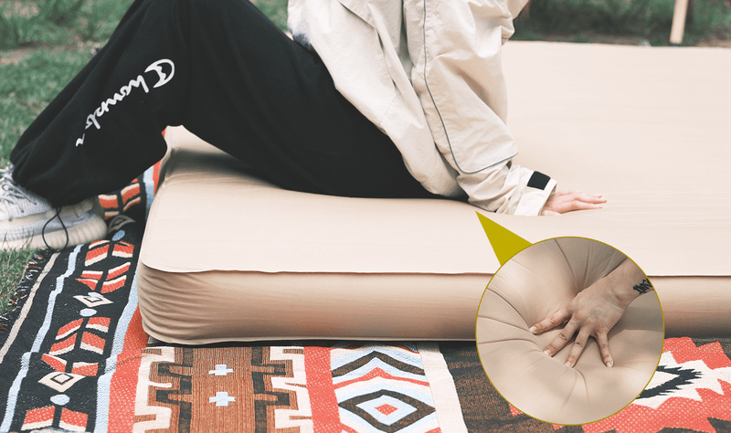 このエアーマットはお客様の改善意見から、商品を改良しました。エアーマットの厚さは10cmで、使用時に地面のゴツゴツ感が体に伝わらず、底つき感もなく、地面からの暑気や寒気もシャットアウトでき、寝心地がいい。