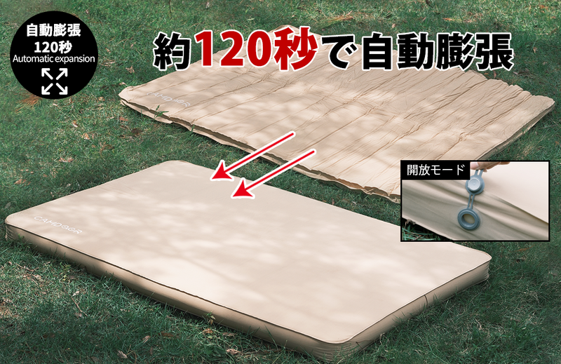 この双人用エアーマットは自動膨張機能を備えており、バルブを開けるだけで自動的に膨らみます。特別なポンプや手動での空気入れは必要ありません。