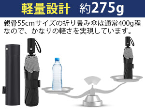 充分な強度を保つ8本骨折りたたみ傘で、重さはわずか275g。折りたたむ時の長さは28cm。カバンに入れて携帯できるスリムサイズで急な雨に降られても適用です。