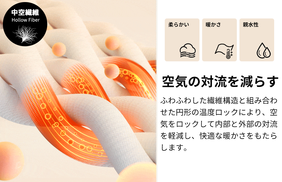 寝袋には使用されている6Dファイバー中空化学繊維は型崩れしにくく、洗濯しても伸びにくい繊維の一種です。 三次元中空糸を立体的に編み込み、二層構造にすることで厚みを増し、暖かい空気を蓄え、優れた保温性を発揮します。 親水性が良いので水になじみやすく、丸洗いも可能です