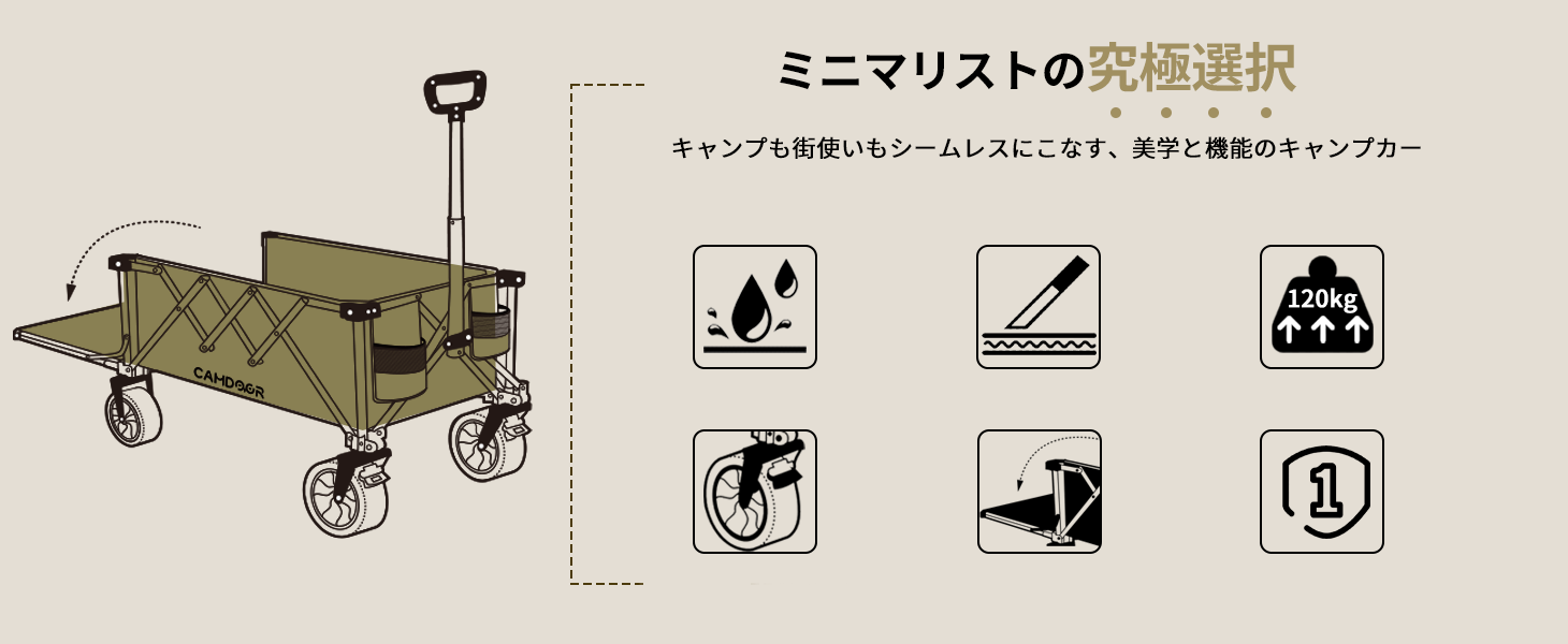 アウトドアでも頼れる、頑丈設計のキャンプカートです。