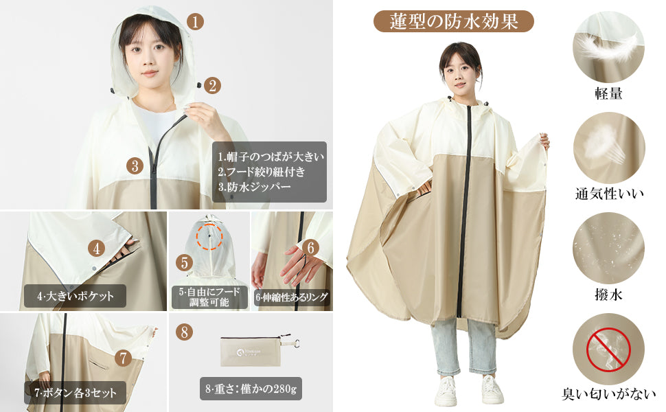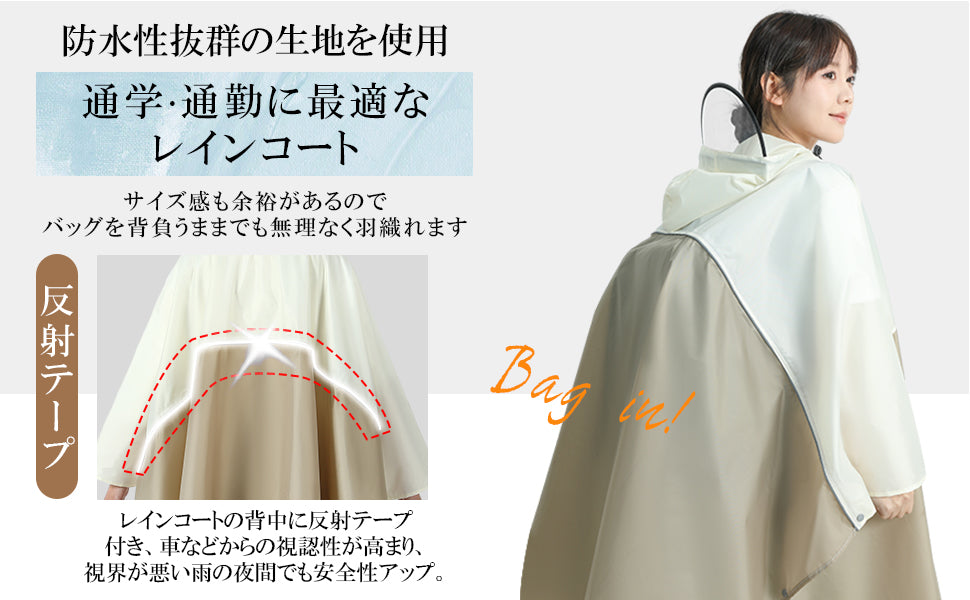 伝統的なレインコートから解放され、オシャレなデザインで通勤や通学の時も利用できます。そして、旅行の時にはただのレインコートとして使えるだけでなく、コートとしても利用できます。リュックを付いても快適に着られる。夜間の使用を考慮すると、反射帯を前面から背面にかけて体を覆うように採用することで、車などからの視認性も高まり。