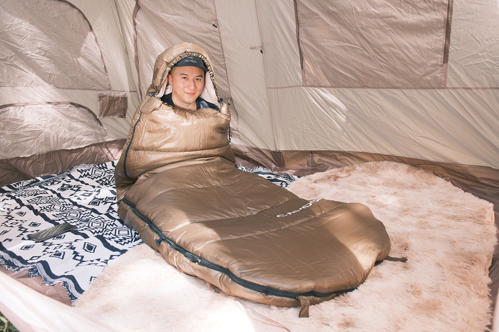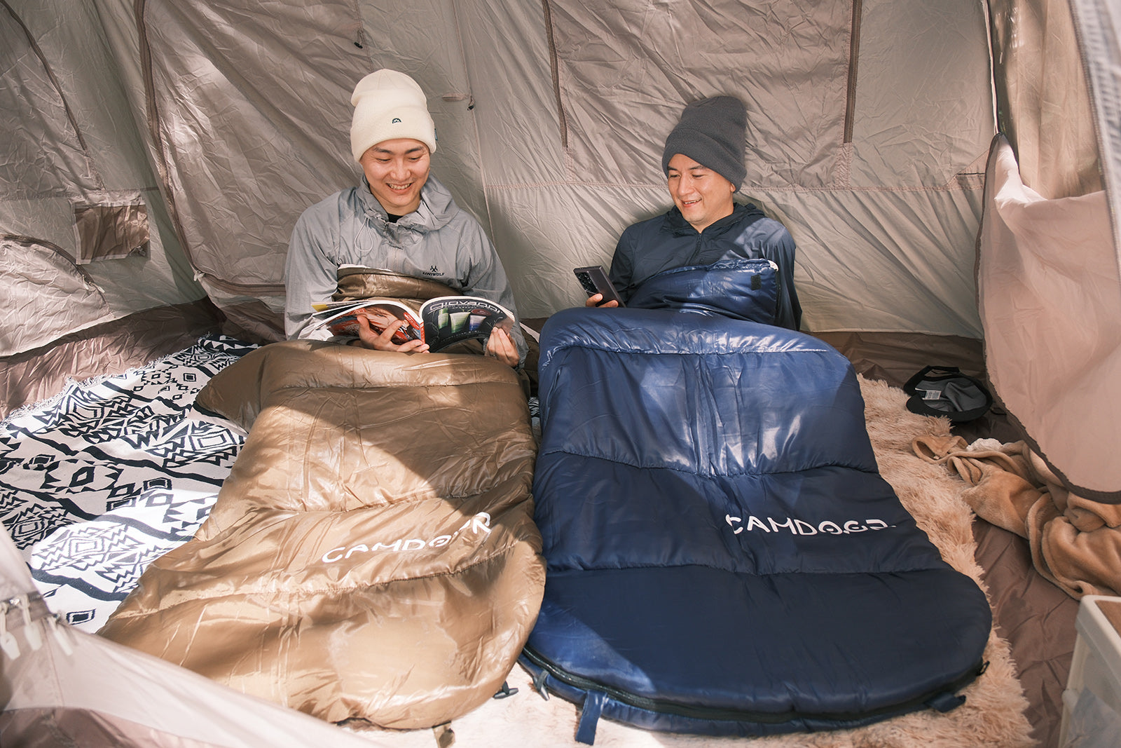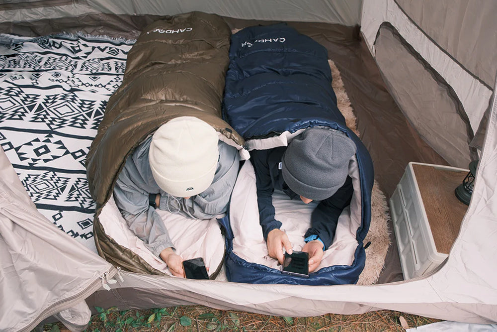 就寝中の温度調節に不可欠な、両側から開閉可能できるダブルファスナー採用している。足元だけの開閉可能、暑くなってきた時に温度調節が可能、熱がこもってムレやすい気温でも快適に過ごせる。寝袋のファスナーで自由に開閉もできるので、 完全に開けば掛け布団的に使用し、家にいてもキャンプ気分が味わえます