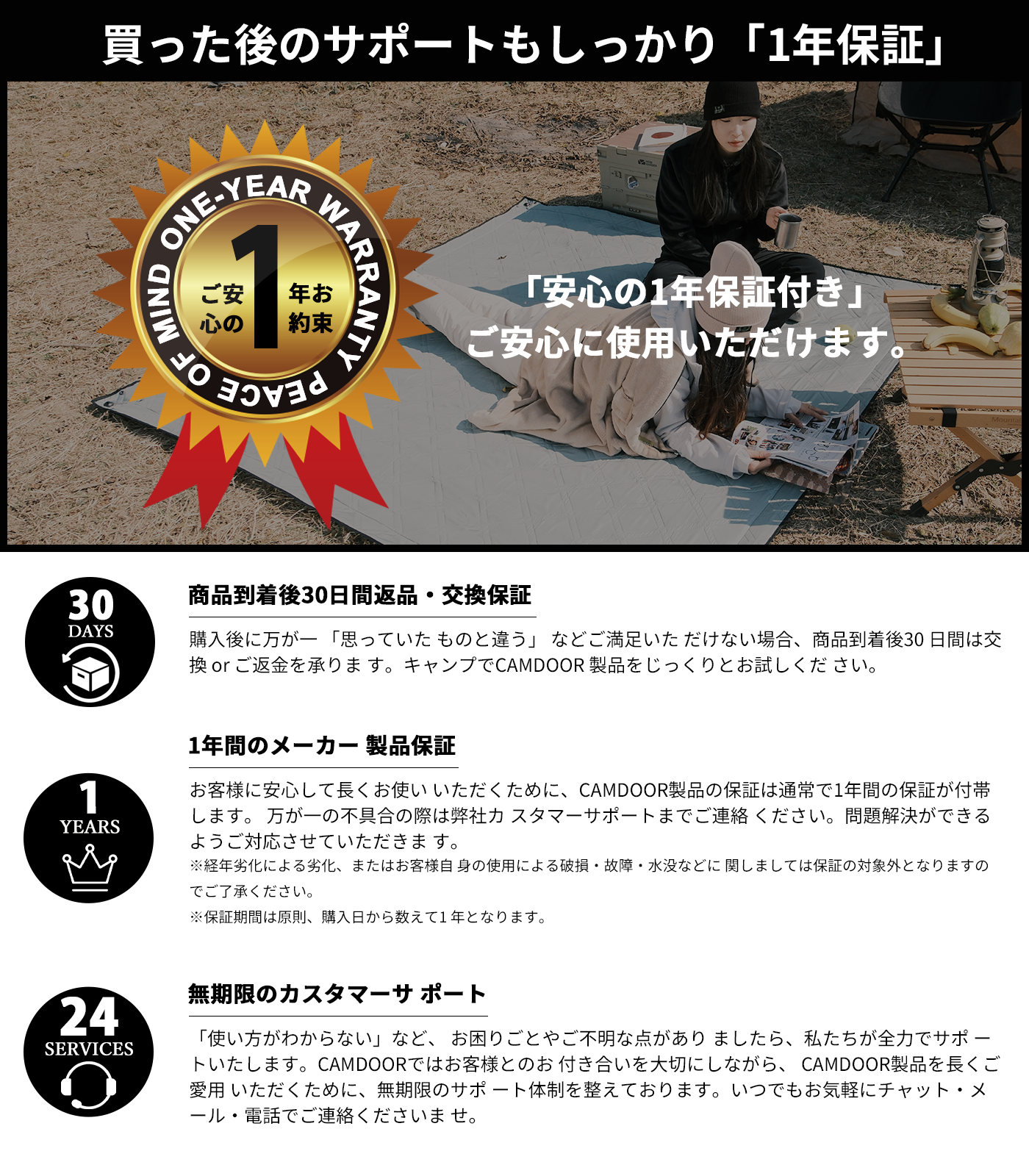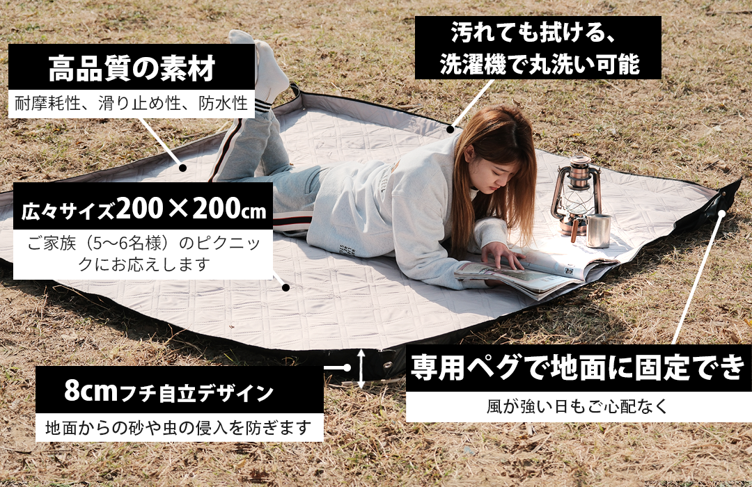 湿った地面でも対応できる、防水性の高いPVCやポリエステル素材を採用。引き裂きや摩耗にも強く、繰り返し使用しても品質を保ちます。また、PEVA(ポリエチレン酢酸ビニル)やラバーコーティングが施された裏面は、滑り止め効果を発揮し、不安定な地面でもしっかり安定。さらに、保温性と断熱性を兼ね備えており、地面からの冷気や熱を遮断するため、季節を問わず快適な使用感を提供します。