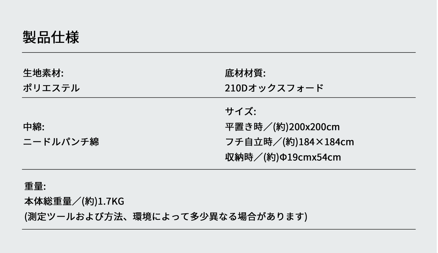 レジャーシートの重量は約1.7kgと軽量で、女性やお子様でも簡単に持ち運べる設計です。高密度ポリエステルやアルミ蒸着シートといった軽量ながら耐久性の高い素材を採用しているため、持ち運び時の負担が少なく、荷物が多くなりがちなキャンプやピクニックでも移動がスムーズ。収納バッグ付きでコンパクトにまとまり、アウトドアだけでなく日常使いでも手軽に活用できます。